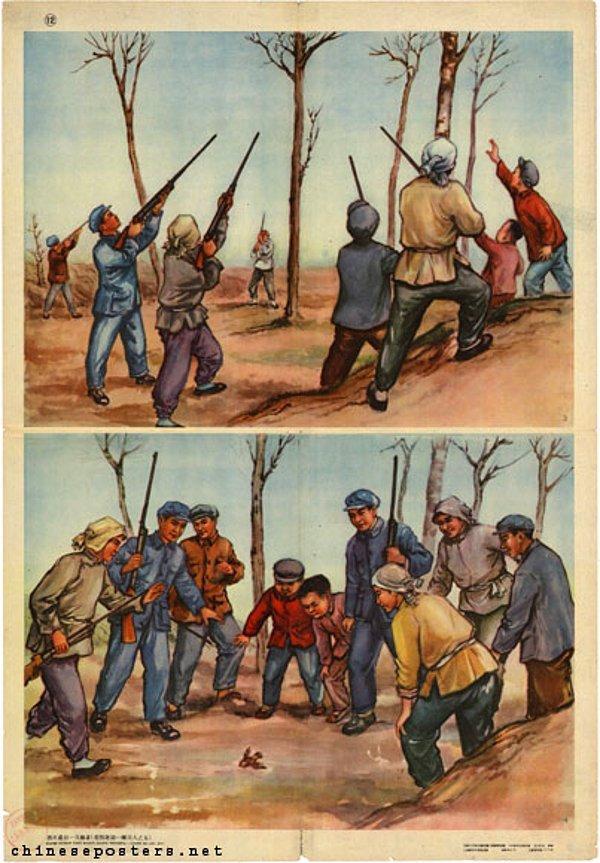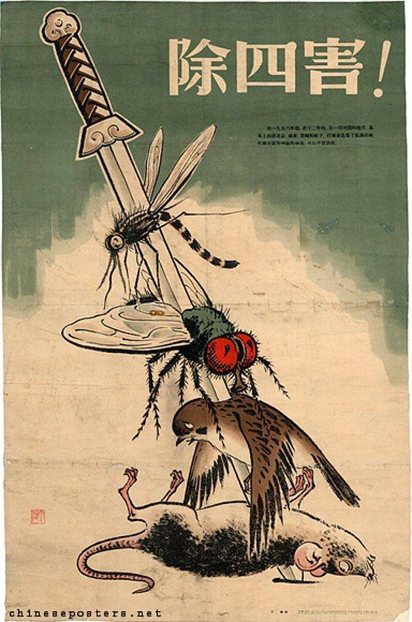 Yaşamın zincirleme birbirine bağlı bir döngü olduğu bilincinden yoksun, ekosisteme çomak sokmanın facia getireceğini hesaba katmayan Diktatör Mao ve yoldaşları ne yapacaklarını şaşırdılar. Zararlı böceklerin sayısı inanılmaz derecede arttı.