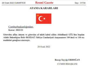 Resmi Gazete’de yayımlanan karara göre, görevinden af talebi kabul edilen Abdulhamit Gül yerine Adalet Bakanı olarak Bekir Bozdağ atandı.