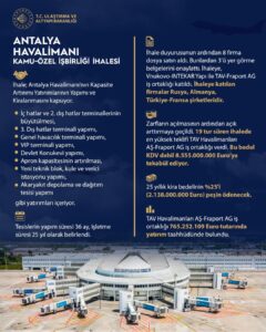 Kamu özel işbirliği ihalesi sonucunda Antalya Havalimanının genişletme ve işletmesi yatırıma açıldı.