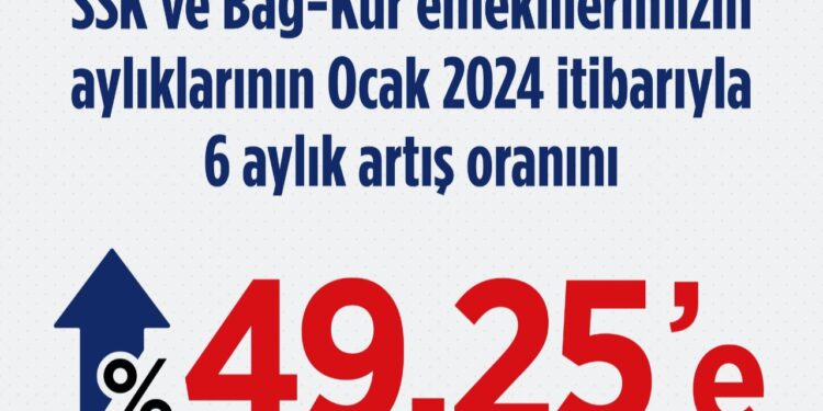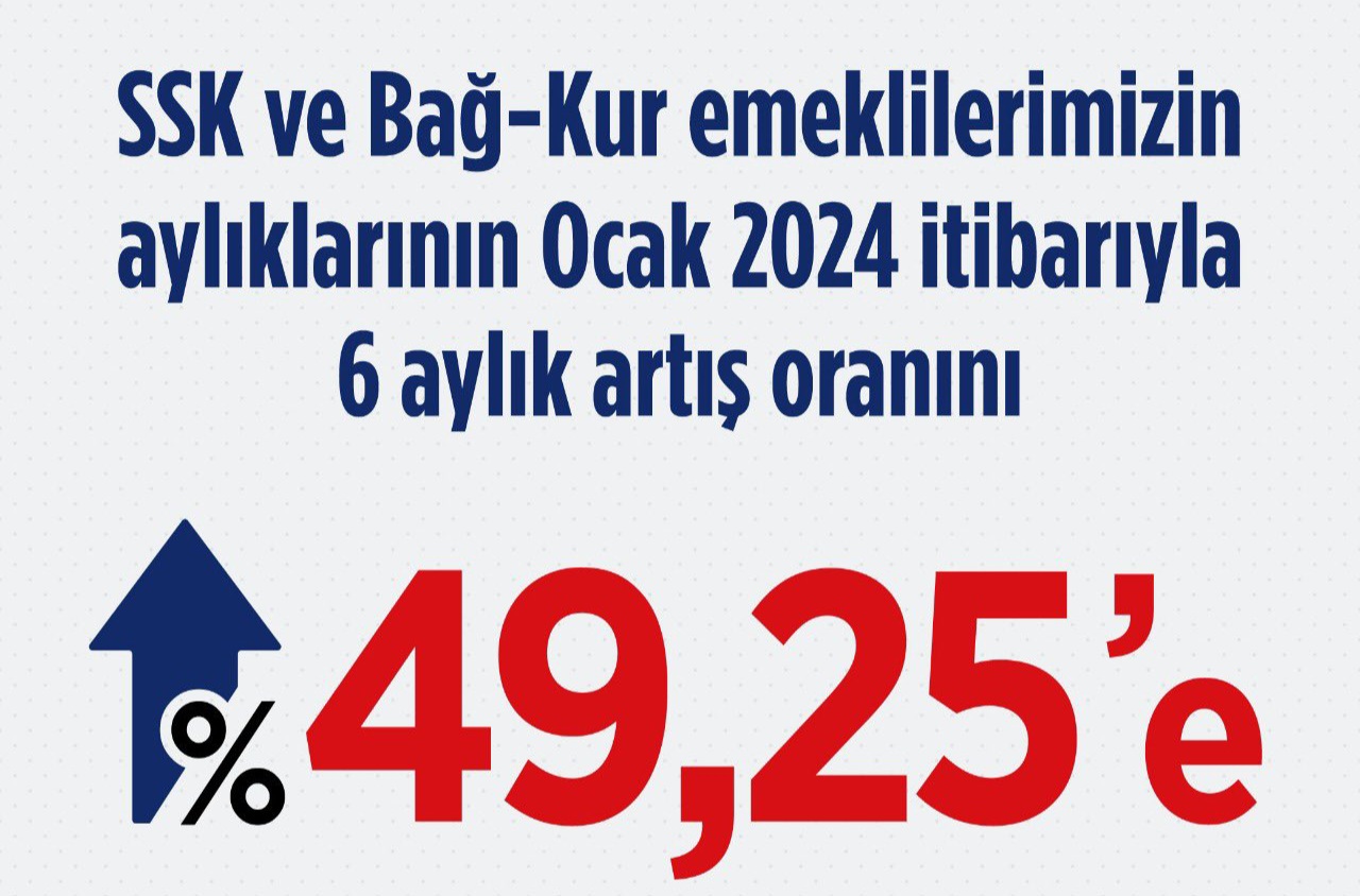 SSK ve Bağ-Kur emeklilerimizin aylıklarının Ocak 2024 itibarıyla 6 aylık artış oranını %49,25’e yükseltiyoruz. Böylece bu yıl tüm emeklilerimizin aynı oranda artış almasını sağlıyoruz.