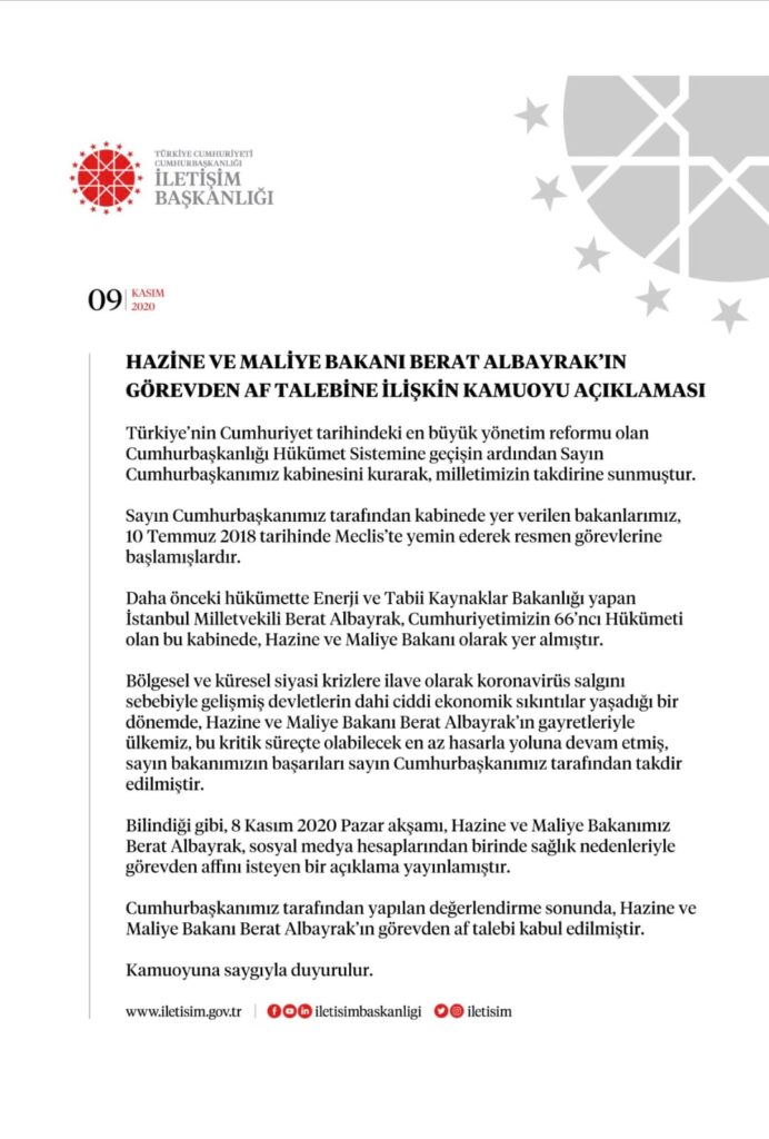 Türkiye Cumhuriyeti Cumhurbaşkanlığı iletişim başkanlığının yaptığı açıklama da Berat Albayrak’ ın görevden ayrılma isteği Cumhurbaşkanı tarafından kabul edildiği belirtildi: