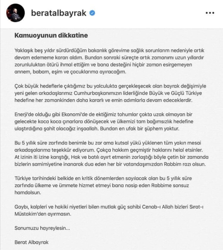 Resmi instagram hesabından yaptığı açıklamada sağlık nedenleri dolayısıyla bakanlığı bırakma kararını açıklayan hazine ve maliye bakanı Berat Albayrak, ihmal ettiği ailesine vakit ayıracağını belirtti.