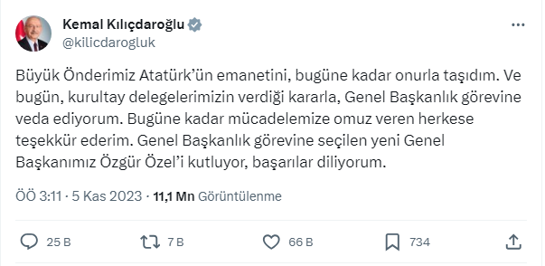 Kılıçdaroğlu, sosyal medya hesabından, “Büyük Önderimiz Atatürk’ün emanetini, bugüne kadar onurla taşıdım. Bugün, kurultay delegelerimizin verdiği kararla genel başkanlık görevine veda ediyorum. Bugüne kadar mücadelemize omuz veren herkese teşekkür ederim. Genel Başkanlık görevine seçilen yeni Genel Başkanımız Özgür Özel’i kutluyor, başarılar diliyorum” ifadelerini kullanarak Özel’i tebrik etti.