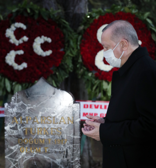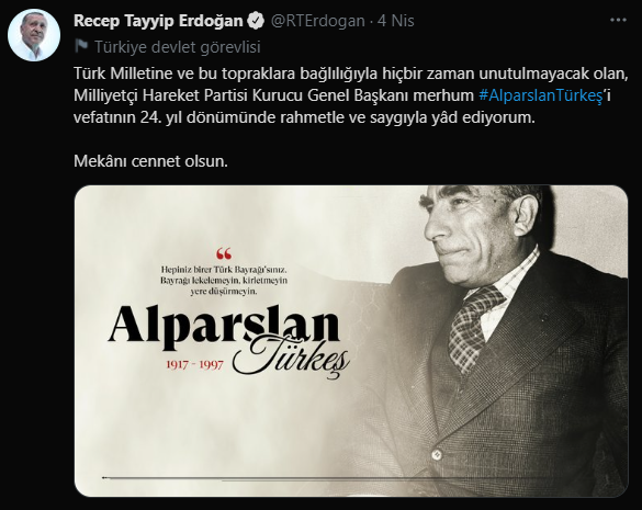Cumhurbaşkanı Erdoğan, öncelikle sosyal medya hesabından Alparslan Türkeş’in ölüm yıldönümünü münasebetiyle taziye tweeti atarak daha sonrada kabrini ziyaret etti.