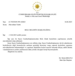 “Bolu Belediye Başkanı’nın Cumhurbaşkanımız Sayın Recep Tayyip Erdoğan’ın seçimi kazanması halinde Bolu’ya heykelini dikmek için talep ettiği muvafakat, hayatını halkına hizmete adamış olan Sayın Cumhurbaşkanımız tarafından reddedilmiştir.