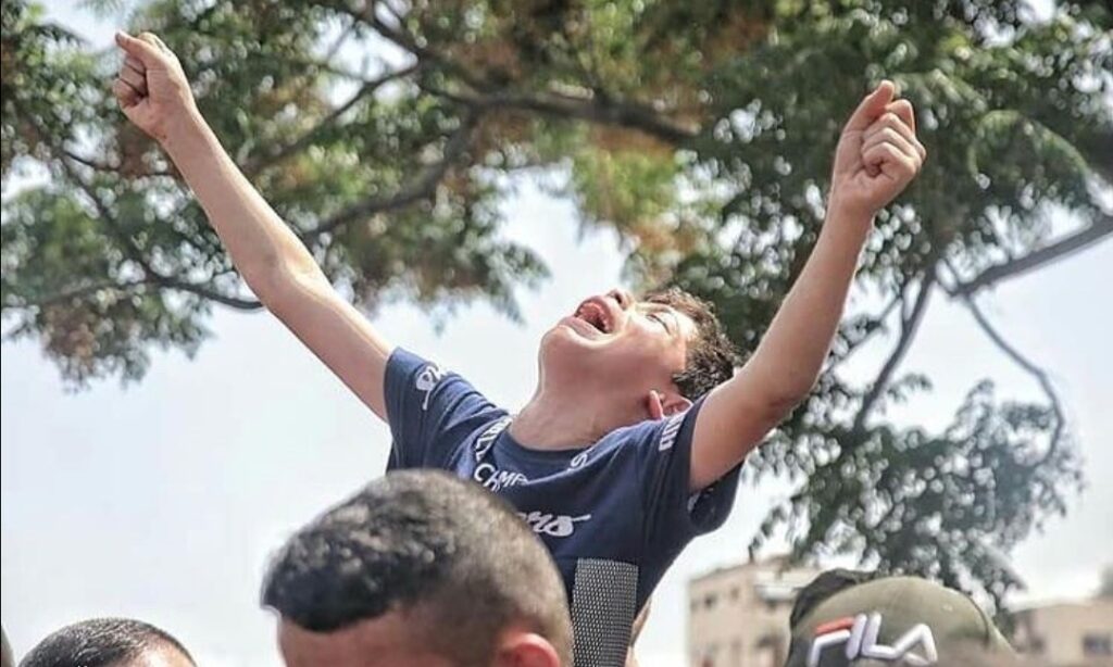 Sosyal medya sitelerinde paylaşılan görüntüde, 12 yaşındaki küçük Bera ağlayarak, 39 yaşında hayatını kaybeden babası Sabır Süleyman ve 16 yaşında öldürülen ağabeyi Muhammed Süleyman’ın omuzlarda taşınan cenazelerinin arkasından koşuyor ve babasına son kez bakmak istediğini söylüyor.