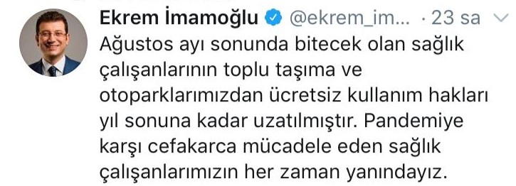 İstanbul Büyükşehir Belediye Başkanı Ekrem İmamoğlu sosyal medya hesabından yaptığı paylaşım ile bu süreçte her zaman sağlık çalışanlarının yanında ve destekçileri olacağını dile getirdi. Toplu taşıma ve otoparkları ücretsiz kullanım süresini yıl sonuna kadar uzattıklarını açıkladı.