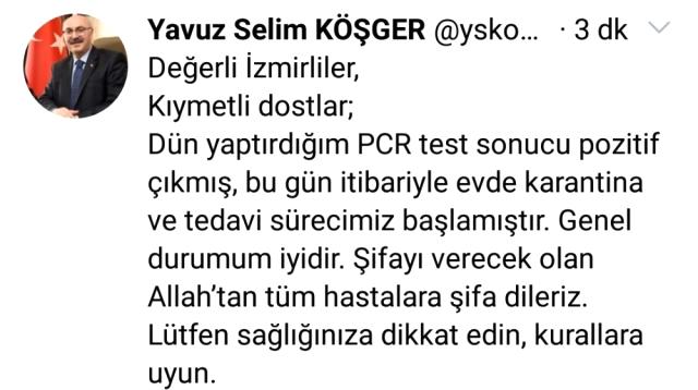 İzmir Valisi Yavuz Selim Köşger, sosyal medya hesabından koronavirüs testi sonucunun pozitif çıktığını duyurdu. Köşger, genel sağlık durumunun da iyi olduğunu aktardı.