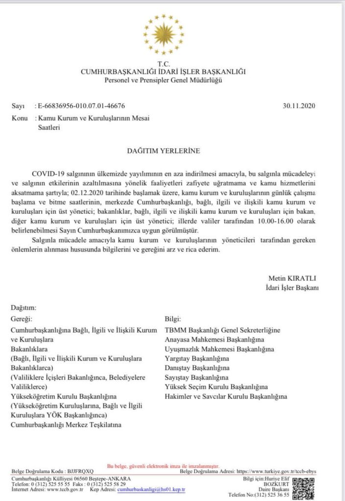 Kamu kurumlarında 2 Aralıktan itibaren çalışma saatleri 10.00 ila 16.00 arasında kısıtlanacağı açıklandı.