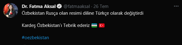 Türkiye’nin kardeş ülkesi Özbekistan, Rusça olan resmi dilini Türkçe olarak değiştirdi. Konuya ilişkin Twitter hesabından paylaşım yapan AK Parti Merkez Karar ve Yönetim Kurulu (MKYK) üyesi ve Edirne Milletvekili Dr. Fatma Aksal, “Kardeş Özbekistan’ı Tebrik ederiz” ifadelerini kullandı.