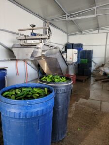 “Tarladan turşuluk malzemeler toplanıyor ve üretim alanımıza geliyor. Eleğe giriyor, elekte kalibrasyon yapılıyor 0-1-2-3-4 numaralara boyutlanarak ayrılıyor. Ondan sonra yıkama makinesine giriyor, orada temizlendikten sonra makineden çıkarken tekrar durulamaya giriyor. Durulamadan sonra iğnelemeye giriyor, iğnelemeden büyük bidonlara boşalıyor.