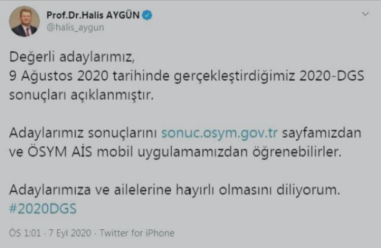 Aygün, Twitter’dan yaptığı açıklamada, “9 Ağustos 2020 tarihinde gerçekleştirdiğimiz 2020-DGS sonuçları açıklanmıştır. Adaylarımız sonuçlarını “sonuc.osym.gov.tr” sayfamızdan ve ÖSYM AİS mobil uygulamamızdan öğrenebilirler. Adaylarımıza ve ailelerine hayırlı olmasını diliyorum.” ifadelerini kullandı.