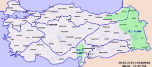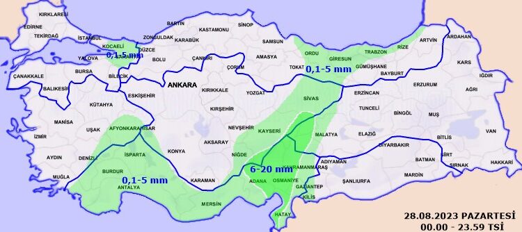“Yapılan son değerlendirmelere göre; 28.08.2023 Pazartesi günü Adana, Hatay, Osmaniye, Mersin’in iç kesimleri, Kahramanmaraş’ın batısı, Kayseri’nin güney ve doğusu, Sivas’ın güneyi ile Niğde’nin doğusunda yerel kuvvetli sağanak ve gök gürültülü sağanak yağış bekleniyor.”