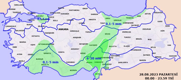 “Yapılan son değerlendirmelere göre; 28.08.2023 Pazartesi günü Adana, Hatay, Osmaniye, Mersin’in iç kesimleri, Kahramanmaraş’ın batısı, Kayseri’nin güney ve doğusu, Sivas’ın güneyi ile Niğde’nin doğusunda yerel kuvvetli sağanak ve gök gürültülü sağanak yağış bekleniyor.”