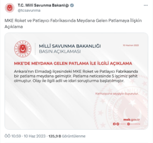 Milli Savunma Bakanlığı (MSB), olayla ilgili yazılı açıklama yaptı. Açıklamada, “Ankara’nın Elmadağ ilçesindeki MKE Roket ve Patlayıcı Fabrikası’nda bir patlama meydana gelmiştir. Patlama neticesinde 5 işçimiz şehit olmuştur. Olay ile ilgili adli ve idari soruşturma başlatılmıştır” denildi.