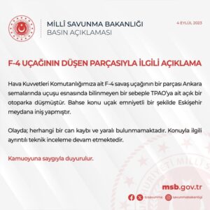 “Hava Kuvvetleri Komutanlığımıza ait F-4 savaş uçağının bir parçası Ankara semalarında uçuşu esnasında bilinmeyen bir sebeple TPAO‘ya ait açık bir otoparka düşmüştür. Bahse konu uçak emniyetli bir şekilde Eskişehir meydana iniş yapmıştır.