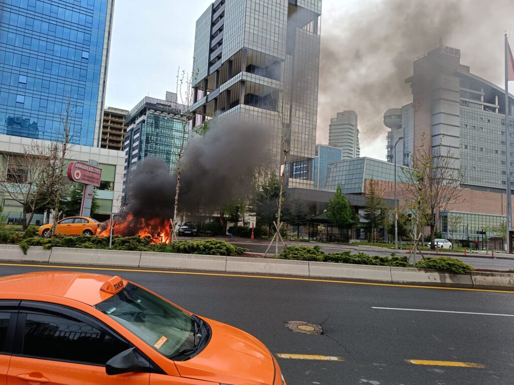 Ankara’nın Söğütözü semtinde park halindeki bir ticari taksi, henüz bilinmeyen bir nedenle alev alarak kullanılamaz hale geldi.