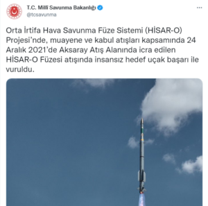 Orta İrtifa Hava Savunma Füze Sistemi (HİSAR-O) Projesi’nde, muayene ve kabul atışları kapsamında 24 Aralık 2021’de Aksaray Atış Alanında icra edilen HİSAR-O Füzesi atışında insansız hedef uçak başarı ile vuruldu.