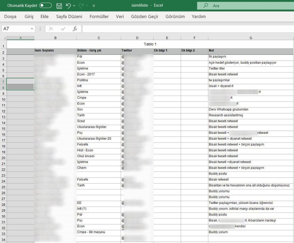 Sosyal medyaya servis edilen bir görselde hazırlanan tablolar dikkat çekiyor. Tablolarda öğrencilerin; öğrenim gördükleri bölüm, kullanıcı isimleri hatta daha öncesinde bu örgüte karşıt nitelikte ne tür paylaşımlar yaptığı dahi bulunmakta.