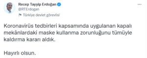 Cumhurbaşkanı Erdoğan kapalı alanlarda maske takma zorunluluğunun kalktığını sosyal medyadan duyurdu.
