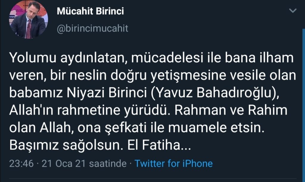 Yavuz Bahadıroğlu (Niyazi Birinci)’ nin oğlu Mücahit birincinin açıklamasında “Yolumu aydınlatan, mücadelesi ile bana ilham veren, bir neslin doğru yetişmesine vesile olan babamız Niyazi Birinci (Yavuz Bahadıroğlu), Allah’ın rahmetine yürüdü. Rahman ve Rahim olan Allah, ona şefkati ile muamele etsin. Başımız sağolsun.” dedi.