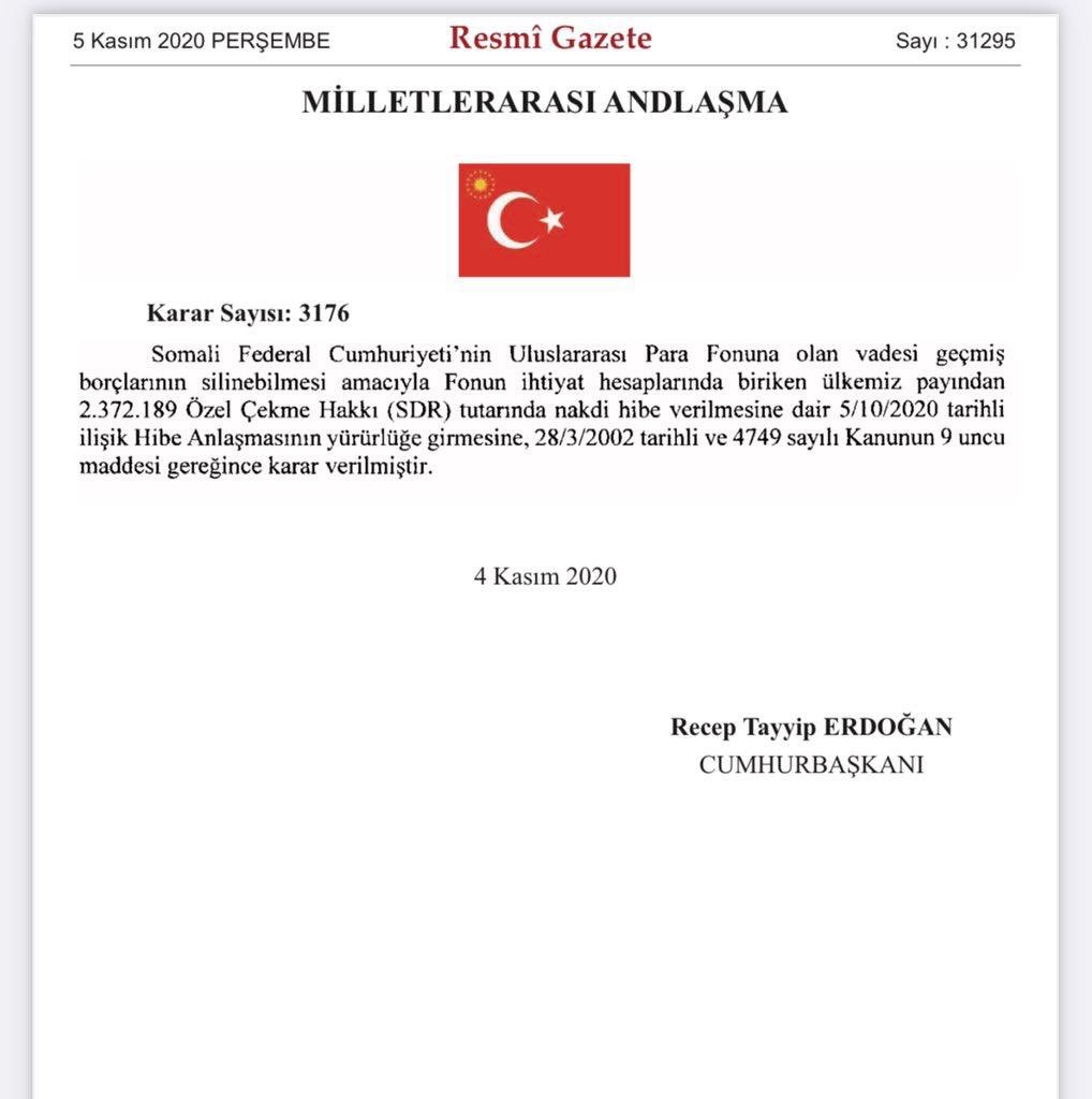 Kararda Somali Federal Cumhuriyetinin IMF’ e olan borcunun 2.372.189 tutarında nakdin hibe olarak verilmesi yer alıyor.