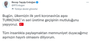 “Bugün, ülkemizin ilk yerli koronavirüs aşısı TURKOVAC’ın seri üretime geçişinin mutluluğunu yaşıyoruz. Tüm insanlıkla paylaşmaktan memnuniyet duyacağımız aşımızın hayırlı olmasını diliyorum.” diye tweet attı.