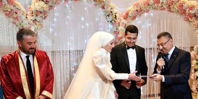 Nikâh şahitlerinden biri olan Cumhurbaşkanı Yardımcısı Fuat Oktay evlilik cüzdanını geline verdi. Yaptığı konuşmada da genç çifti tebrik edip sağlık ve mutluluklar temennisinde bulundu.