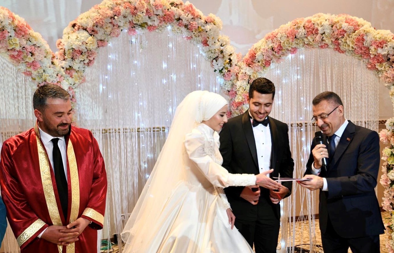 Nikâh şahitlerinden biri olan Cumhurbaşkanı Yardımcısı Fuat Oktay evlilik cüzdanını geline verdi. Yaptığı konuşmada da genç çifti tebrik edip sağlık ve mutluluklar temennisinde bulundu.